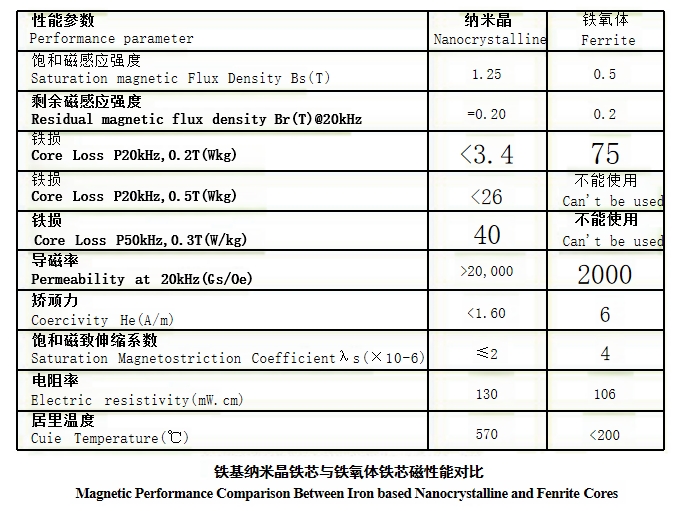 纳米晶材料同时具备硅钢、坡莫合金和铁氧体的优点,高频逆变电源的工作频率在20kHz~50kHz, 作为电源心脏的主变压器,传统的铁芯材料铁氧体虽高频损耗较低,但其100kHz 以下频段的磁导率较低,且 其饱和磁感应值 (Bs) 较低,铁芯的体积和重量仍较大,此外,铁氧体的居里温度较低,热稳定性差,温 度稍高即导致Bs 值降低,易饱和,工作状态不稳定,不适合于高频大功率下使用。纳米晶材料,具有优良 的综合磁性能,特别是应用在高频大功率逆变电源上铁芯的首选。纳米晶铁芯不仅用于逆变焊机电源,而 且广泛用于电解电镀设备、感应加热设备、充电设备、通信电源、 UPS 电源、X 光机电源、激光电源、变频 调速电源等领域。